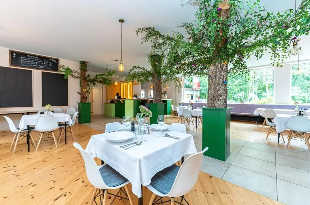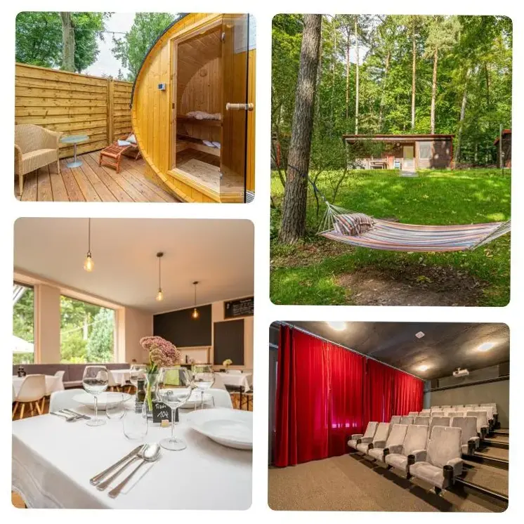 Der Natura Ferienpark - Bungalows am Grimnitzsee Schorfheide in Althüttendorf bietet familienfreundliche Unterkünfte mit privaten Badezimmern, vollständig eingerichteten Kochnischen und Ausblick auf den Garten. Jeder Bungalow verfügt über ein Sofa-Bett, einen Essbereich sowie moderne Geräte wie Kaffeemaschine und Fernseher. Die Freizeitangebote umfassen eine Sauna, eine Sonnenterrasse, einen Außenbereich zum Entspannen sowie einen Kamin im Freien. Zusätzlich stehen Spielbereiche sowohl innen als auch außen zur Verfügung, gemeinsame Grillmöglichkeiten und ein Minimarkt. Das lokale Restaurant bietet vielfältige Mahlzeiten an, ergänzt durch ein Café und Freisitze. Nahegelegen finden sich Sehenswürdigkeiten wie das Kloster Chorin (9 km), die Schanzen Am Papengrund (23 km) und die Stadthalle Bernau (26 km). Der Flughafen Berlin Brandenburg ist 68 km entfernt.